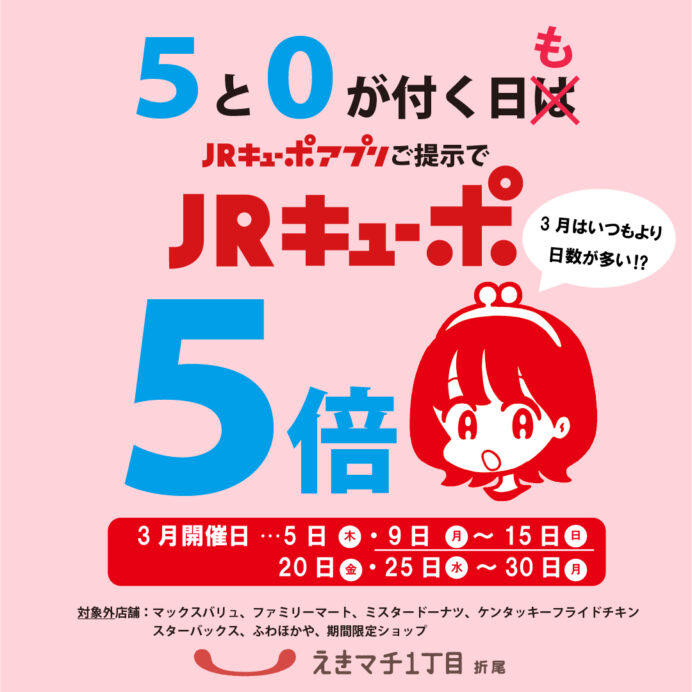 5と0がつく日に、えきマチ1丁目折尾のJRキューポ加盟店でのお買物・お食事の際にJRキューポアプリのご提示で、JRキューポを通常の5倍付与いたします!