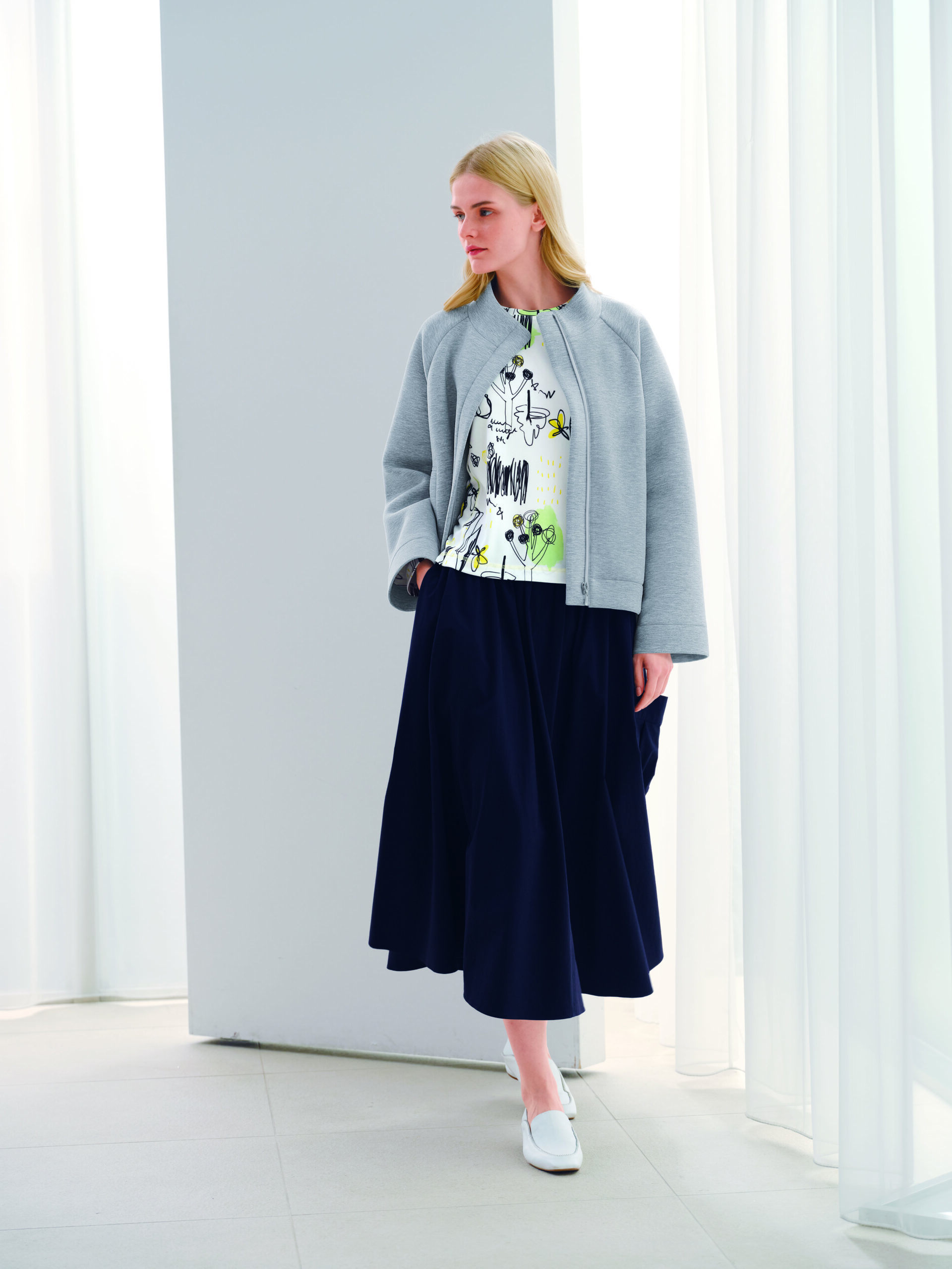 ポケットが可愛いアクセントのフレアスカートを合わせ、